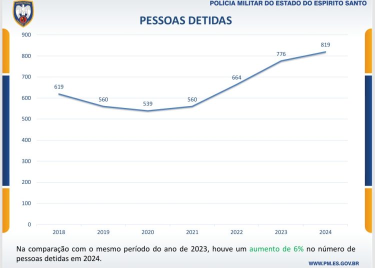 Detenções Realizadas: Foram efetuadas 819 detenções, representando um aumento de 6% em relação ao ano anterior e o maior número registrado na série histórica, demonstrando a eficiência das ações policiais.