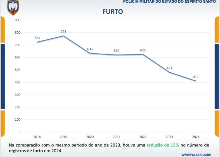 Furtos: Houve uma expressiva redução de 15% nos registros de furto em relação a 2023, com o menor número absoluto registrado na série histórica – 411 em 2024 ante o pico de 773 em 2019. Destaque para os furtos de veículos, que caíram 35%, marcando o melhor desempenho desde 2018.