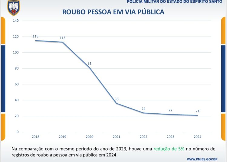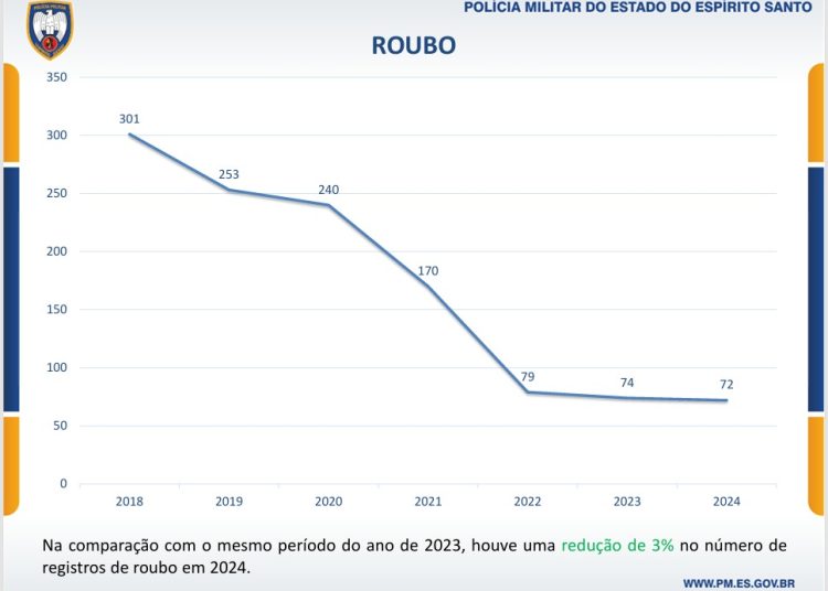 Roubos: A incidência de roubos diminuiu 3%, com reduções marcantes nos roubos de veículos (-36%) e roubos a pessoas em via pública (-5%). O número de roubos também foi o menor já registrado na série histórica – foram registrados 72 roubos em 2024 ante a um pico de 301 em 2018.