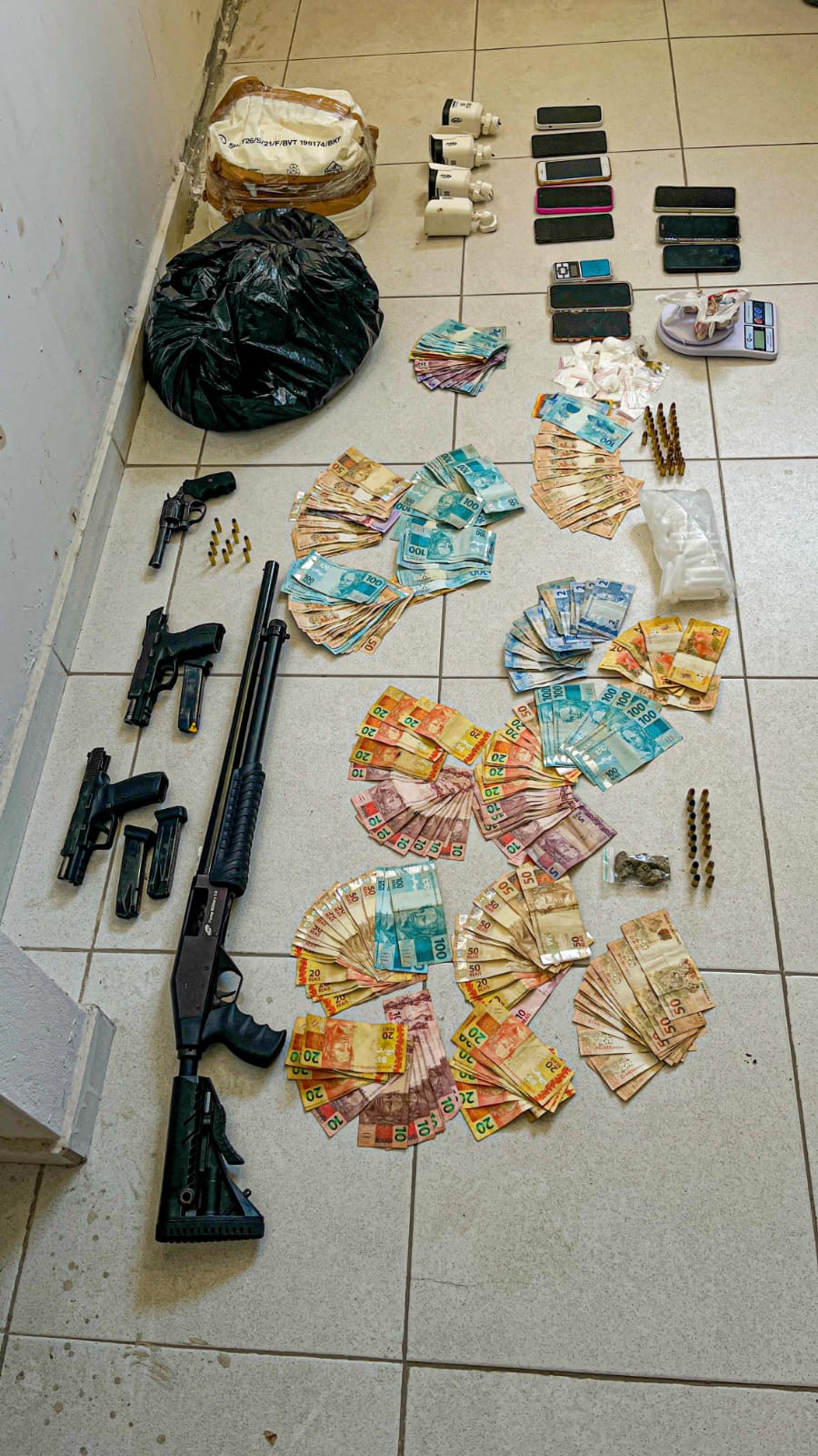 Em outro imóvel no mesmo bairro, os militares localizaram um homem de 19 anos em posse de um revólver calibre 38, 10 munições e R$ 1.164,00. Já na residência de outro alvo, um homem de 29 anos, foram apreendidos uma pistola 9mm com 16 munições, uma espingarda calibre 12, R$ 4.767,00, uma porção de skunk, 20 quilos de cocaína e uma porção de crack, além de um aparelho digital de vídeo e quatro câmeras que estavam em postes públicos em duas ruas próximas ao imóvel.