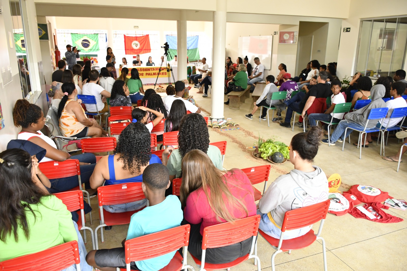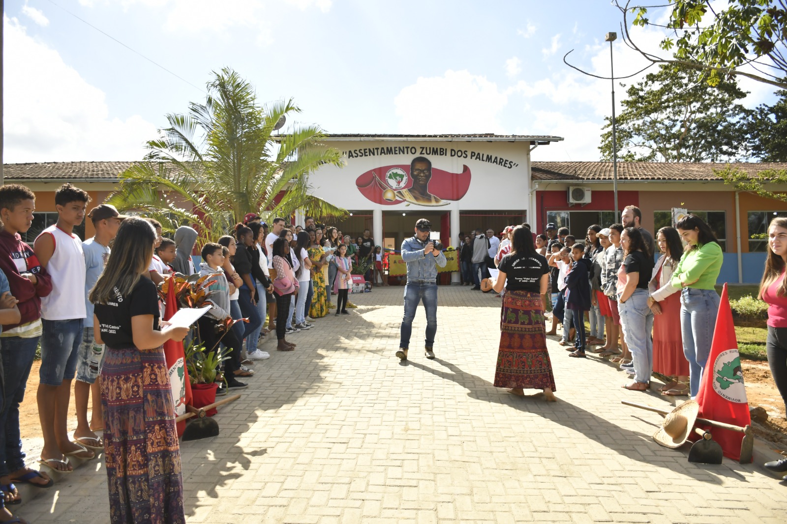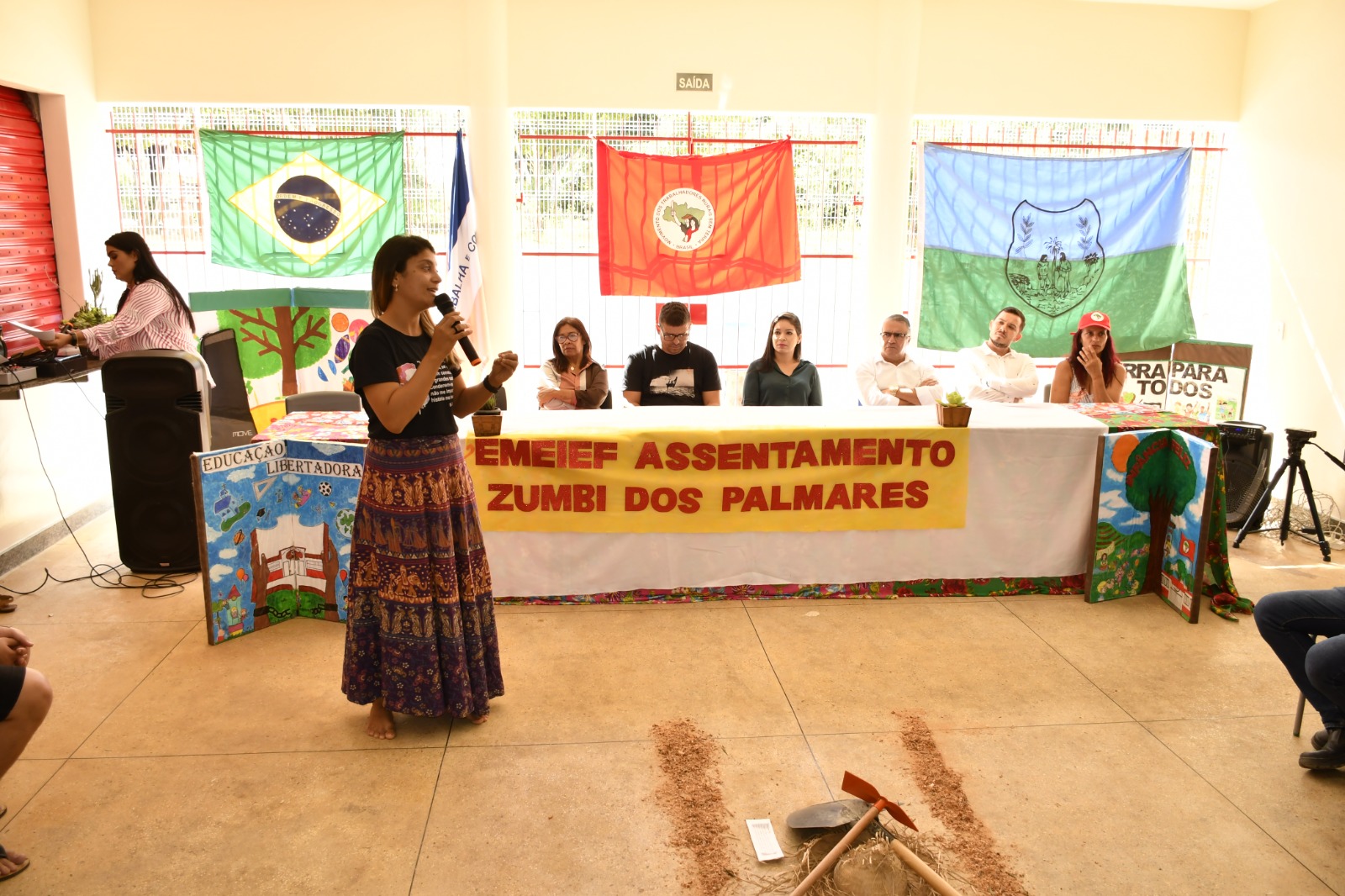 A diretora da EMEIEF Zumbi dos Palmares, Mariana Mota, falou da relação simbiótica Escola-Reforma Agrária: “Temos uma concepção enquanto Movimento, que sem Escola, sem Educação, a Reforma Agrária não está completa. E Assentamento, Acampamento do MST, tem que ter Escola. E que não seja uma escola qualquer, mas que traga no seu jeito de ensinar e de aprender, a coragem e o desejo de continuar na terra, trabalhando, produzindo alimentos saudáveis. O desejo de construir novas relações. Que não nos coloque em situação de desigualdade, de preconceito. O desejo de construir uma sociedade diferente.”