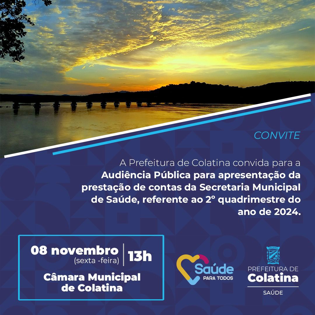 A Prefeitura Municipal de Colatina convida a todos para a audiência pública para apresentação da prestação de contas da Secretaria Municipal de Saúde, referente ao 2º quadrimestre do ano 2024.