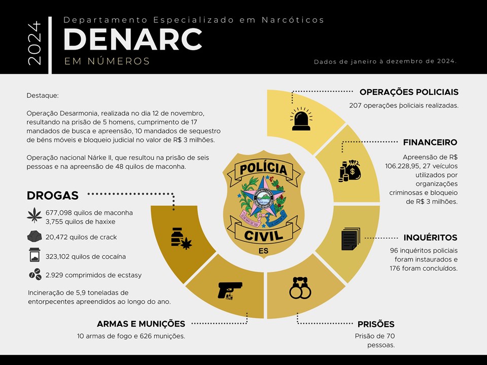 A Polícia Civil do Espírito Santo (PCES) apresentou os dados do trabalho desenvolvido pela Denarc durante o ano de 2024 e comemorou os resultados obtidos. No âmbito investigativo, 96 inquéritos policiais foram instaurados e 176 foram concluídos. As ações levaram à apreensão de dez armas de fogo, 626 munições e 27 veículos utilizados por organizações criminosas.