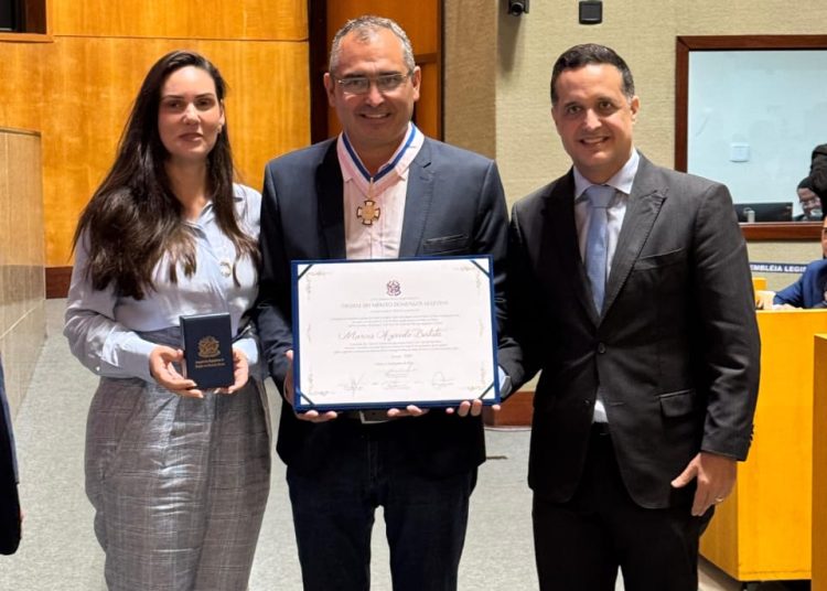 O deputado estadual Fabrício Gandini (PSD) concedeu hoje (11), na Assembleia Legislativa, a Comenda Domingos Martins ao prefeito eleito de São Mateus, Marcus Azevedo Batista, o Marcus da Cozivip (Podemos).