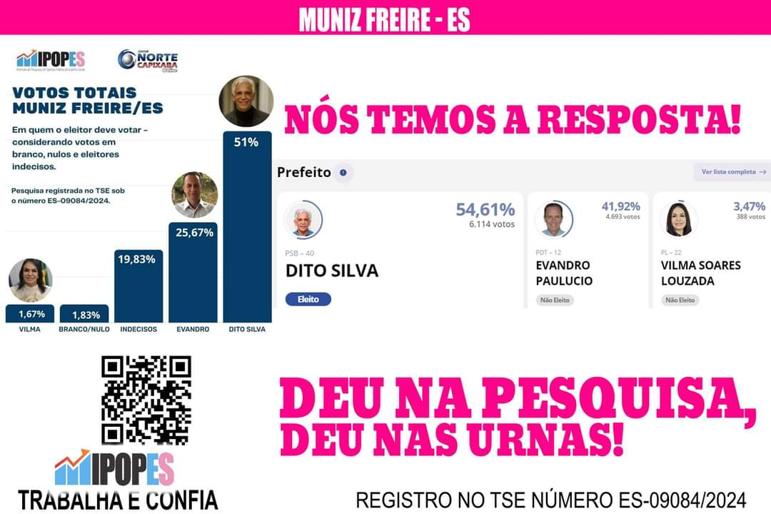 O instituto Ipopes Pesquisas, com sede em Linhares-ES, e mais de uma década de atuação, foi a única empresa a prever com precisão o resultado das eleições em Muniz Freire-ES. Em uma pesquisa registrada no TSE no dia 30 de setembro, sob o número ES-09084/2024, o levantamento apontava a reeleição do prefeito Dito Silva, do PSB, com 51% das intenções de voto. Quando as urnas foram abertas, Dito Silva confirmou sua vitória com 54,61% dos votos, validando o trabalho do instituto.