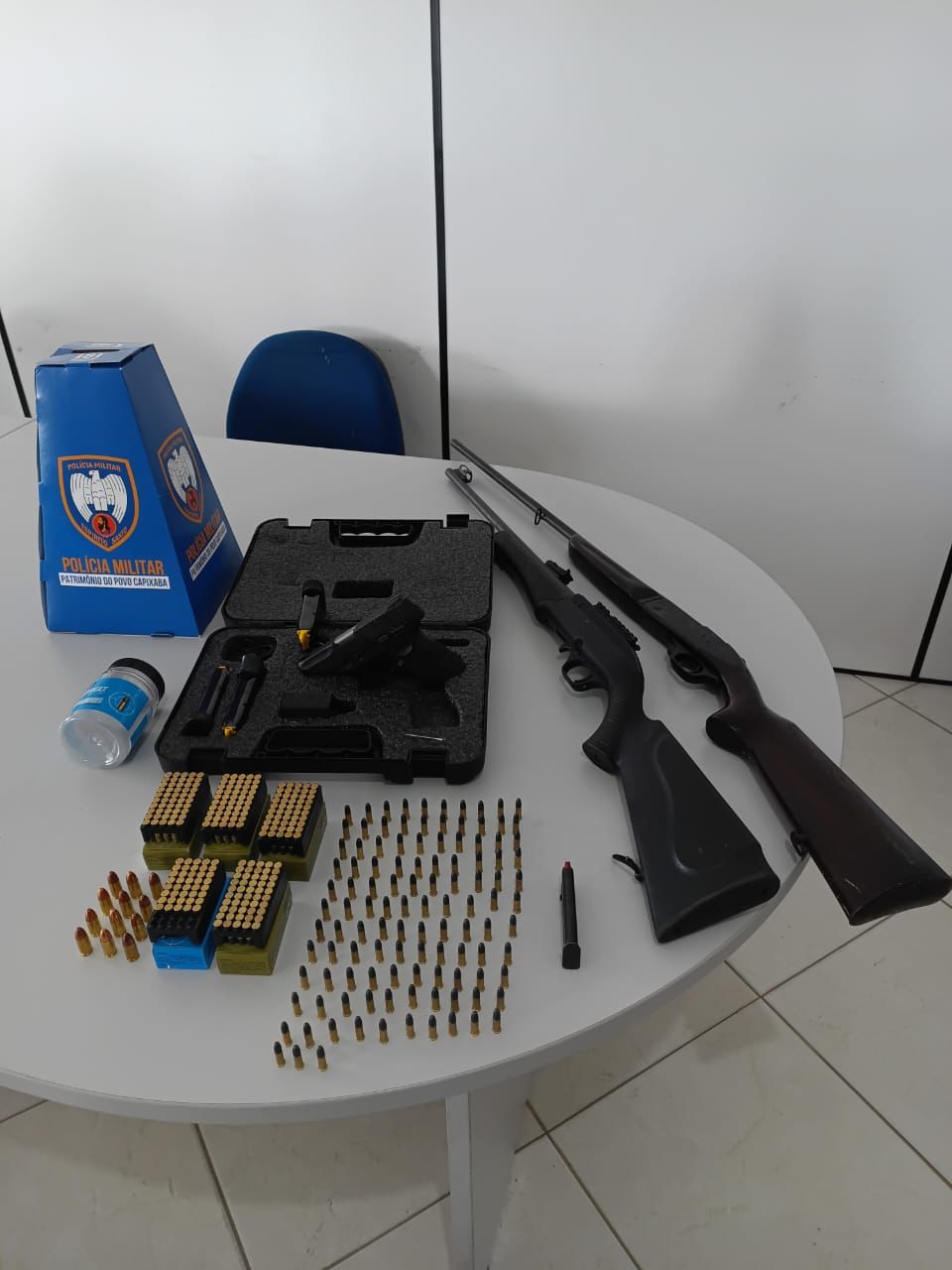 Segundo relatos, o homem agredia sua esposa constantemente e a ameaçava com uso de arma de fogo. Em sua residência foram localizados 2 rifles, 1 pistola e grande quantidade de munições, todo material foi apreendido e entregue à Depol junto com o detido.