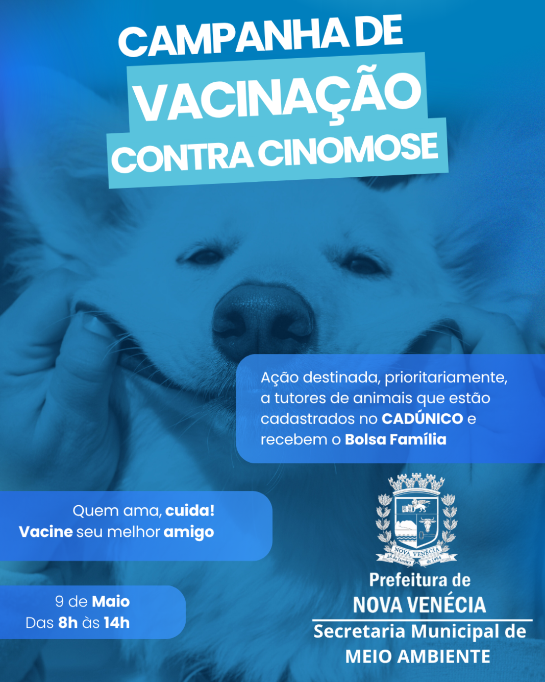 A Prefeitura de Nova Venécia, por meio da Secretaria Municipal de Meio Ambiente, realizará no próximo dia 9 de maio, das 8h às 14h, uma importante campanha de vacinação animal, com foco principal na prevenção da cinomose, uma grave doença viral que acomete cães.