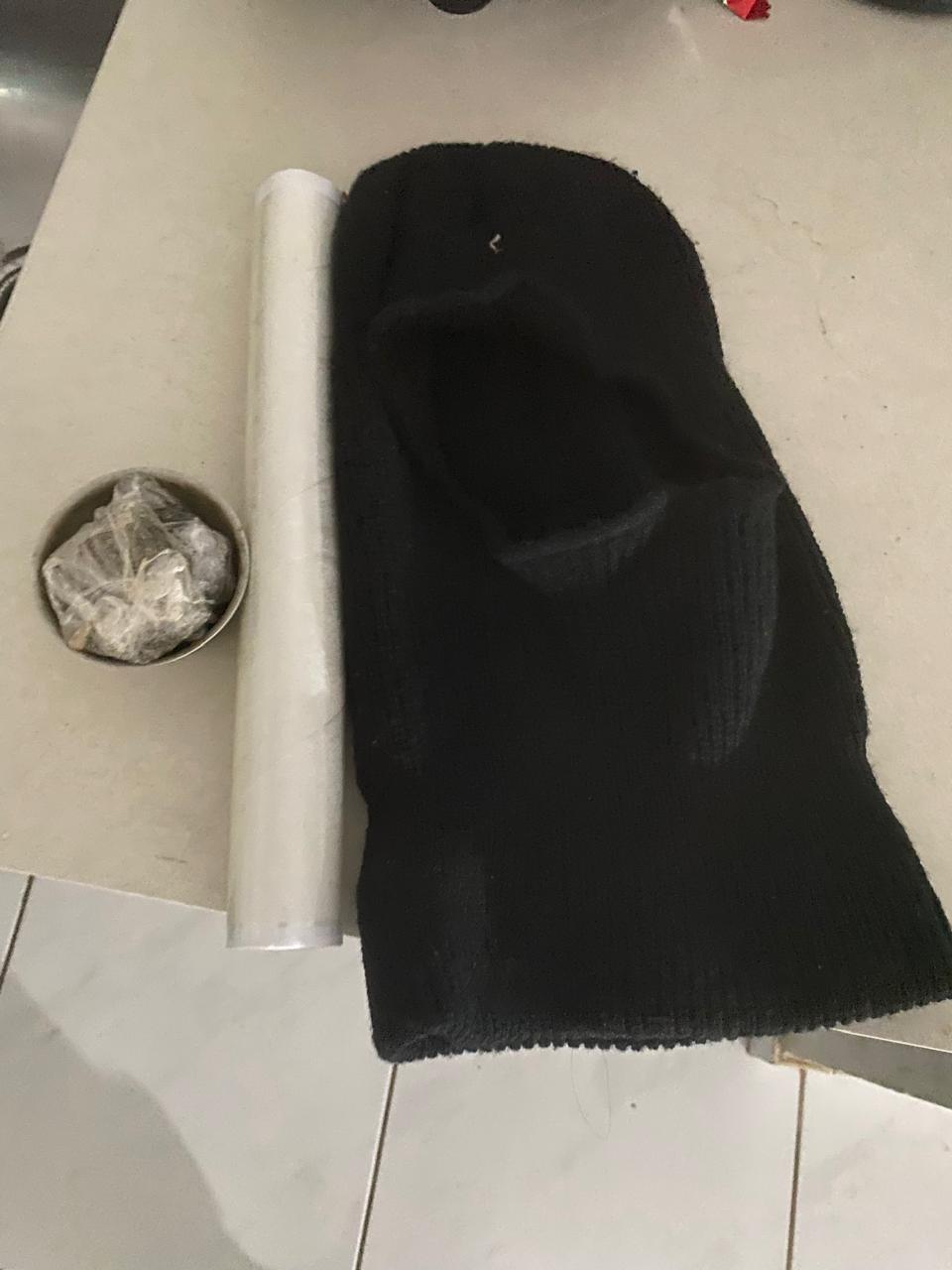 Na residência de um dos suspeitos foram encontrados cinco grandes pedaços de maconha, um simulacro de arma de fogo, uma touca ninja e um celular. Durante a ação, o indivíduo foi questionado quanto a localização do armamento e então confessou ter entregue a outro envolvido.