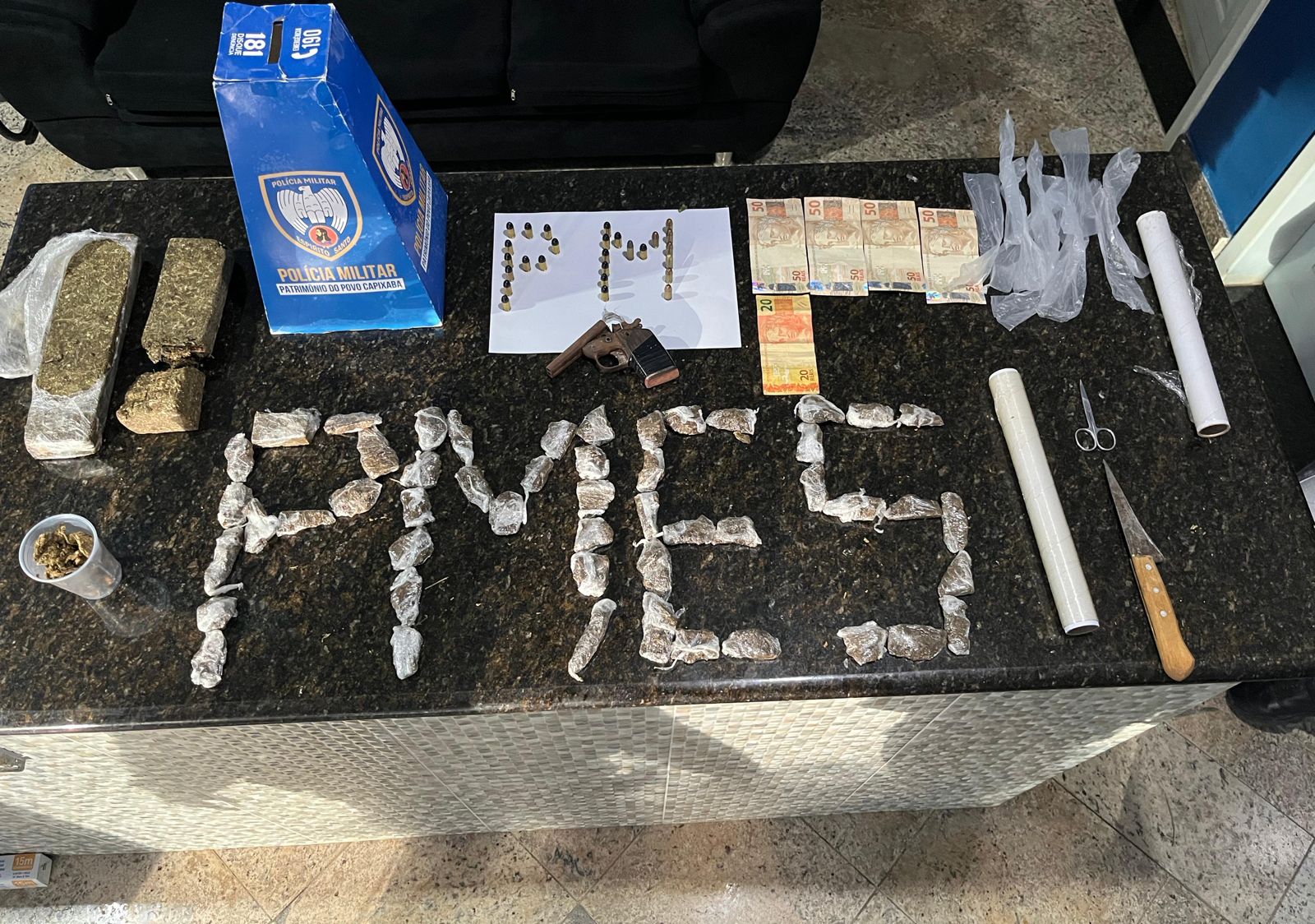 No local utilizado como base para o tráfico, os policiais apreenderam uma garrucha calibre .32 sem numeração aparente, 25 munições calibre .380, uma munição calibre 9mm e uma munição calibre .32. Além do armamento, foi localizada uma expressiva quantidade de entorpecentes, composta por um tablete grande de maconha com 561 gramas, um tablete médio de 331 gramas, um pedaço menor de 116 gramas, 53 buchas da mesma substância e uma unidade de sacolé contendo diversos fragmentos da droga. Também foram recolhidos R$ 220,00 em espécie, dois rolos de papel filme, sacolas plásticas para embalo, uma faca e uma tesoura.