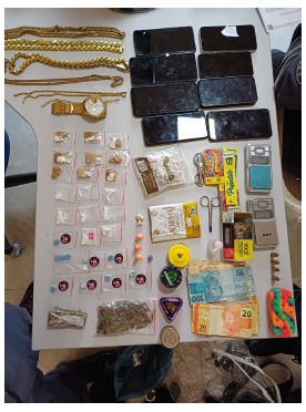 As buscas resultaram na apreensão de R$ 846,00 em espécie, 15 buchas de maconha, três pinos de cocaína, oito papelotes da mesma substância, nove papelotes de haxixe, um grande tablete de maconha, nove cartelas de adesivo para embalagem, 10 comprimidos de ecstasy, uma pedra de crack, 226 pinos de cocaína, um pacote de maconha pesando 12,9 gramas, quatro munições calibre 9mm, duas balanças de precisão, além de material para embalo de drogas e anotações de venda de entorpecentes.