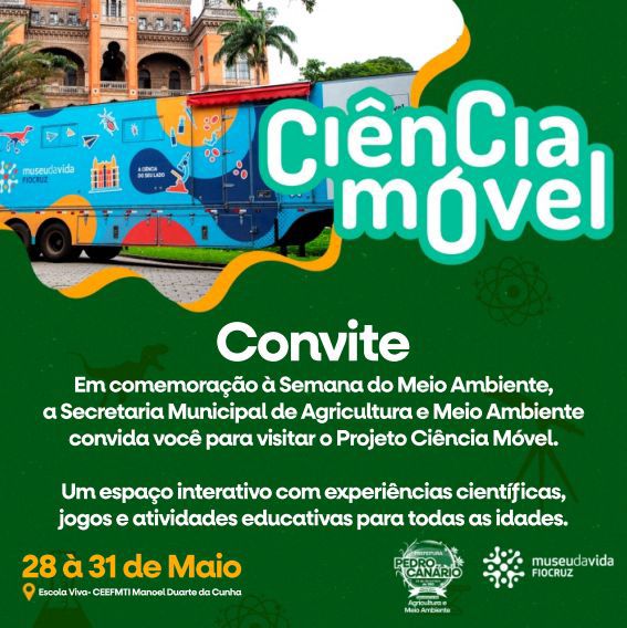 Em comemoração à Semana do Meio Ambiente, a Prefeitura de Pedro Canário realiza, de 28 a 31 de maio, uma programação inédita com a chegada do projeto Ciência Móvel, da Fundação Oswaldo Cruz (Fiocruz), um dos maiores centros de pesquisa em saúde pública do Brasil. Pela primeira vez no município, o museu itinerante transforma um caminhão em um espaço moderno e interativo com exposições, oficinas, vídeos educativos e espetáculos artísticos que unem ciência, saúde, arte e tecnologia.