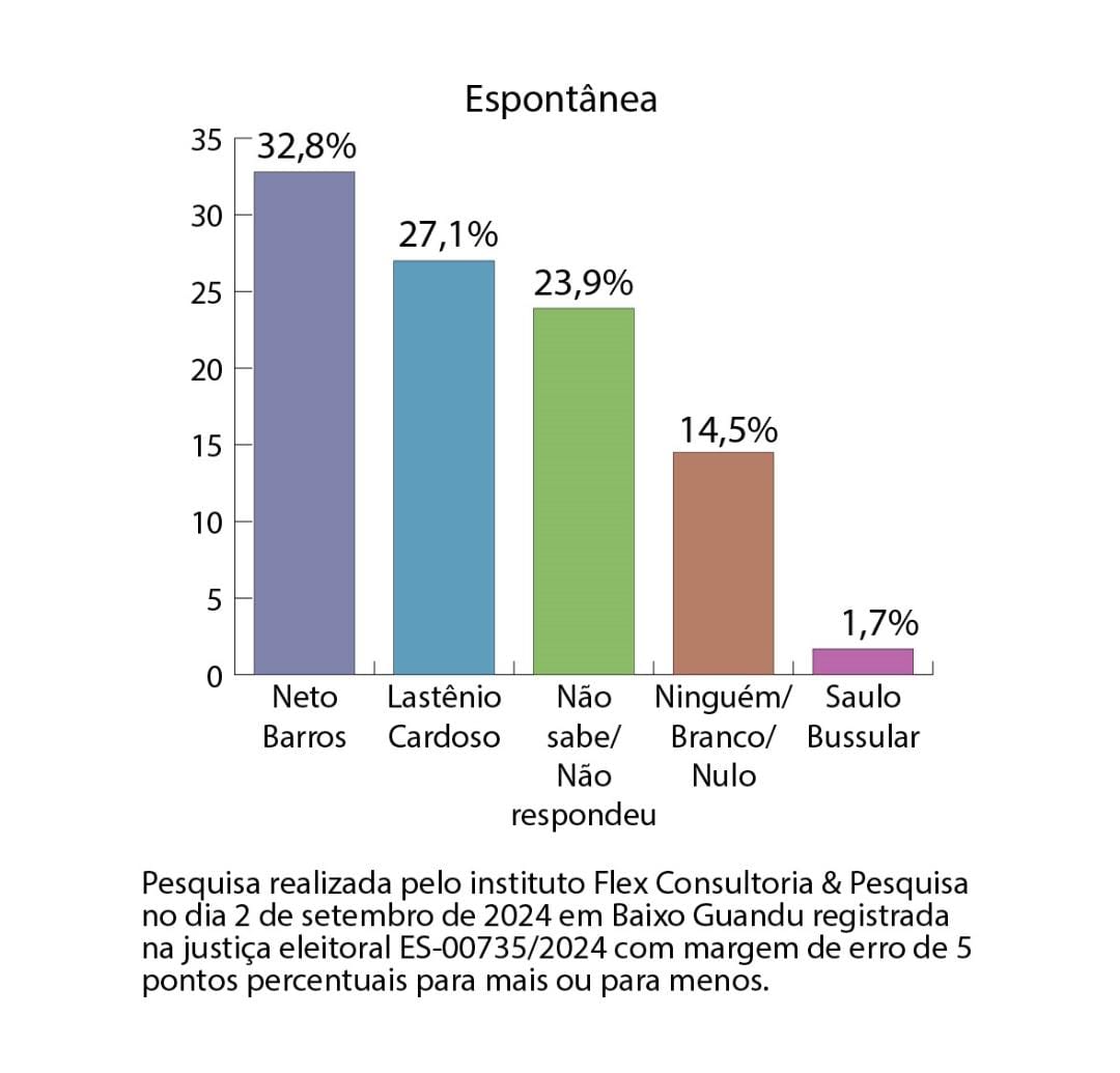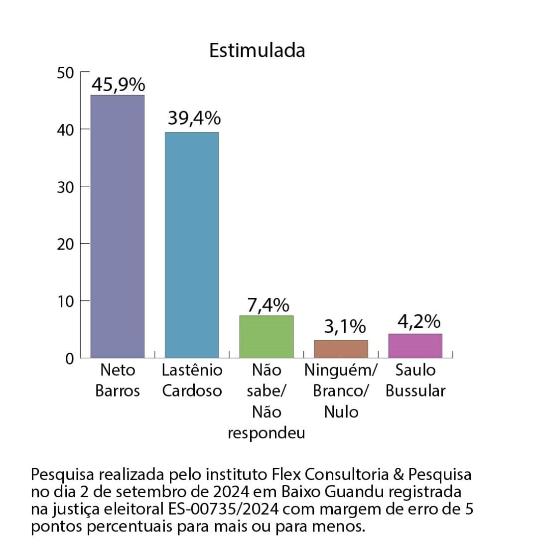 Em uma disputa acirrada pela prefeitura de Baixo Guandu, o ex-prefeito Neto Barros (PP) esta na liderança nas pesquisas de intenção de voto, segundo dados divulgados pelo Instituto FLEX Consultoria & pesquisas.
