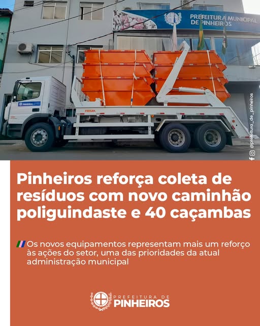 – Pinheiros recebeu, nesta segunda-feira (12), um caminhão poliguindaste e 40 caçambas estacionárias, ampliando a estrutura destinada à coleta de resíduos e à limpeza urbana. Os novos equipamentos representam mais um reforço às ações do setor, uma das prioridades da atual administração municipal.