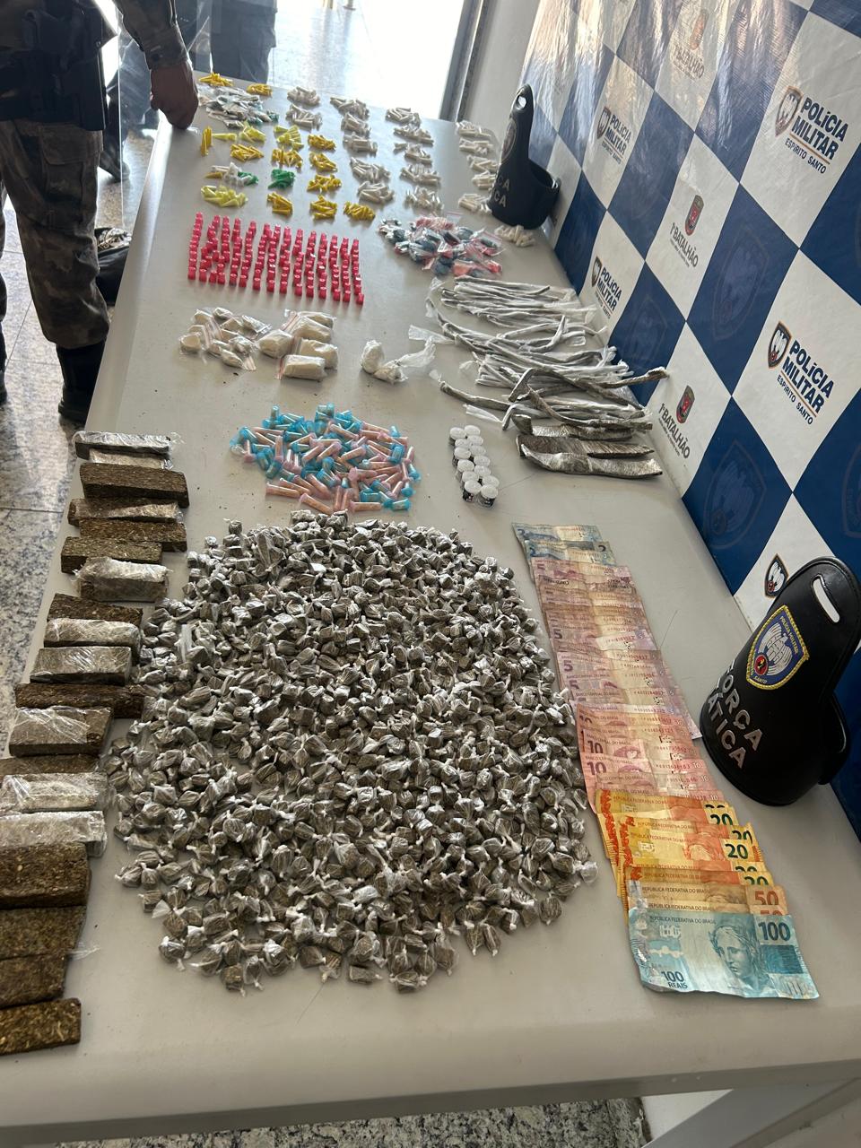 Policiais militares da Força Tática da 12ª Companhia Independente, com o apoio da Patrulha de Morro do 1º Batalhão, Força Tática da Unidade e Patrulha de Morro do Batalhão de Ações com Cães (BAC), apreenderam na tarde desta terça-feira (20), R$456,00 em espécie, 337 pinos de cocaína, 78 papelotes da droga, 964 buchas de maconha, 38 tiras do entorpecente, 20 pedaços da substância, 13 unidades de skunk, 57 unidades de haxixe, além de 249 pinos de crack no bairro Bomfim, Vitória. Ninguém foi detido.