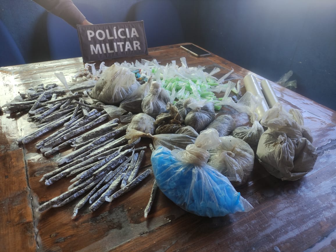 Buscas foram realizadas em todo o entorno, mas o suspeito não foi mais localizado. No entanto, no imóvel de onde ele havia saído, foram encontradas diversas sacolas contendo maconha, pesando um total de 1,3 quilo, e outras 69 buchas da mesma substância, além da cocaína, crack e loló.