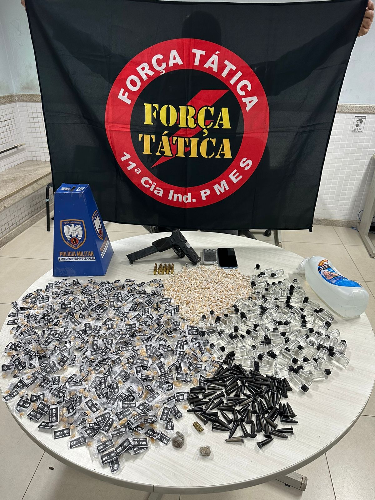 Após chegar ao local, a equipe realizou um cerco tático e visualizou o indivíduo saindo e jogando uma pistola com dois carregadores. Diante do flagrante, a equipe entrou nas residências e, na primeira delas, foram apreendidas 1.640 pedras de crack, além de 97 frascos de loló, 84 pinos de cocaína e uma balança de precisão.