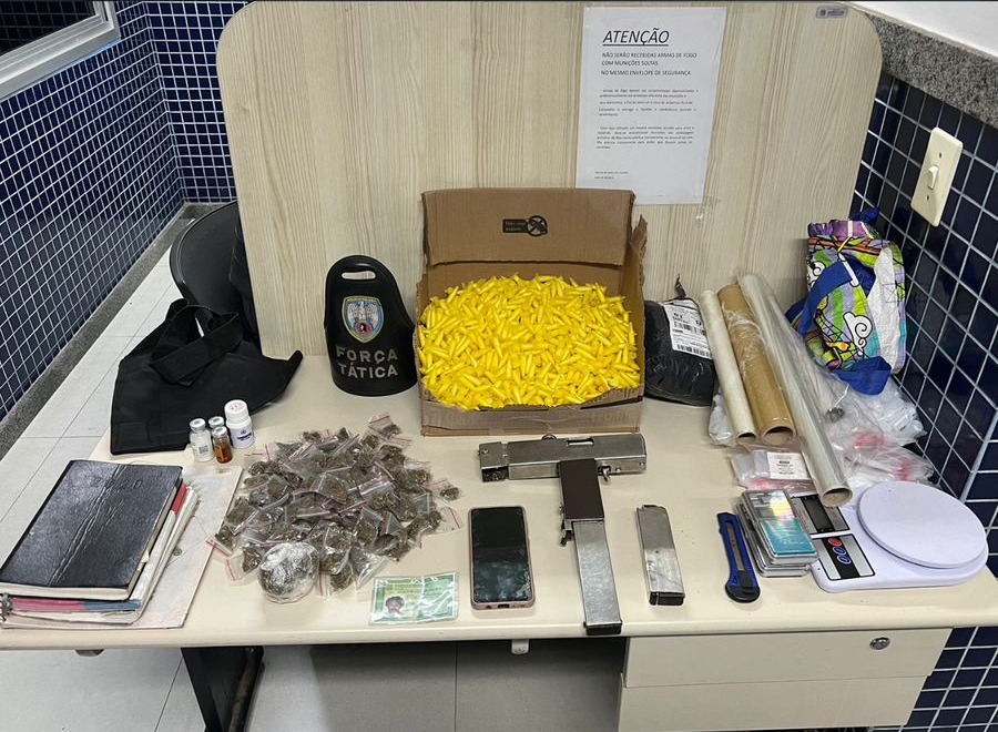 As guarnições prosseguiram até a casa do suspeito de 28 anos e o localizaram. Durante as buscas no quarto do homem foram localizados 99 pinos de cocaína, além de buchas maconha, material para embalo, balanças de precisão, cadernos com anotações do tráfico e remédios anabolizantes. Na residência também foi encontrada uma submetralhadora cal. 40 de fabricação artesanal e dois carregadores, sendo um alongado com capacidade para 25 munições e o outro com capacidade para 15 munições.