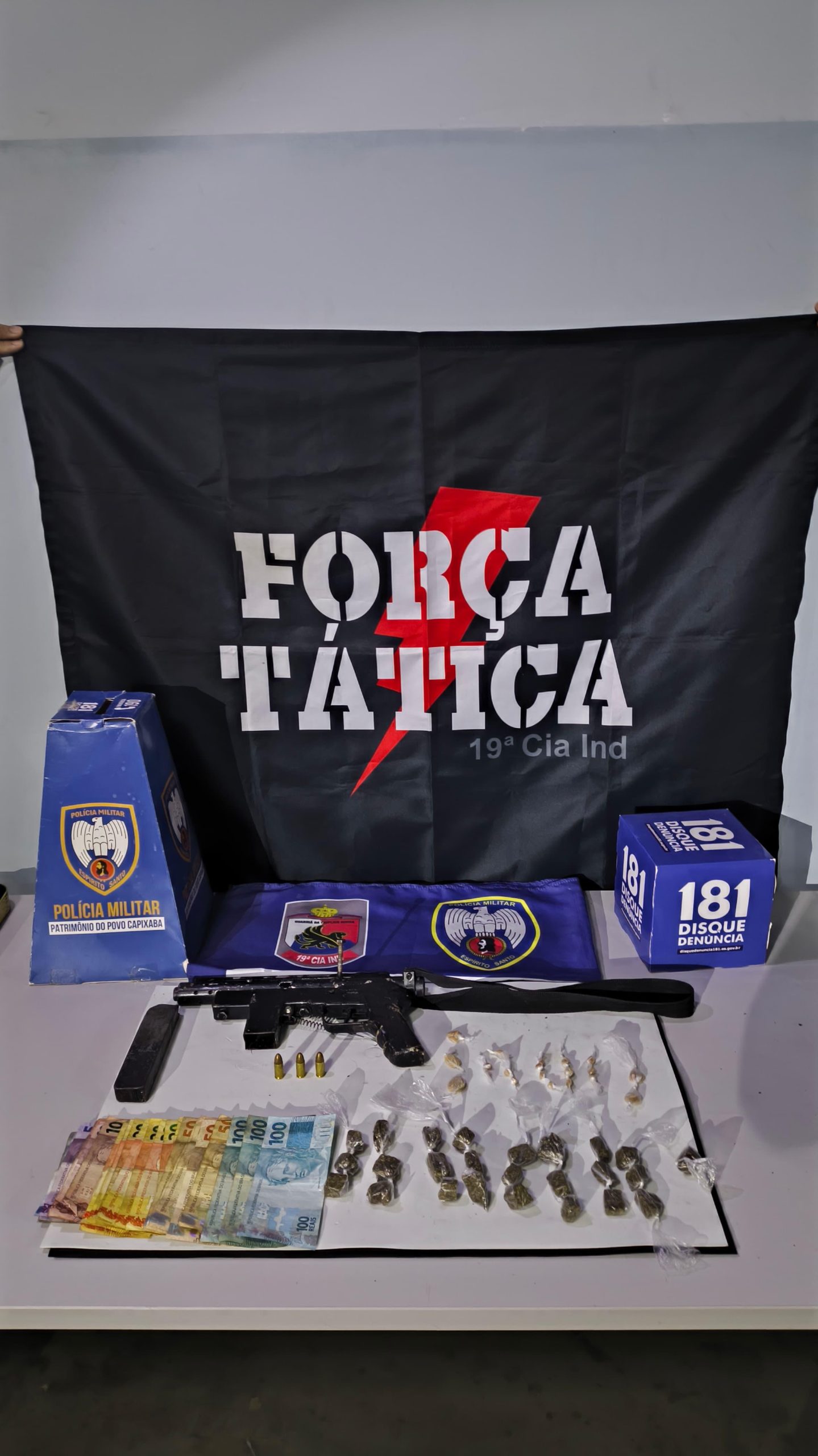 Dentro do imóvel, foi detido Luan dos Santos Vieira de Almeida, conhecido como “Cara de Alpiste”. Com ele, os militares encontraram uma submetralhadora de fabricação artesanal calibre 9mm, carregada com três munições — uma na câmara e duas no carregador. Além da arma, foram apreendidas 20 pedras de crack, 25 buchas de maconha prontas para venda e R$ 874,00 em dinheiro.