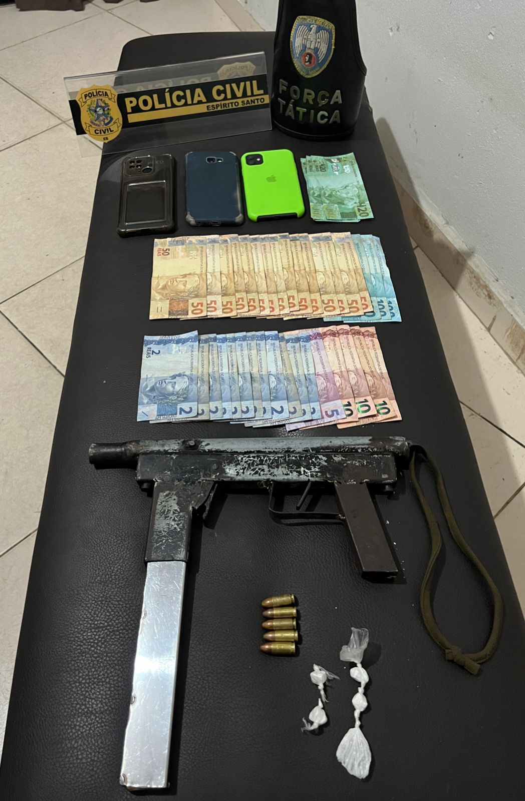 Foi iniciado o acompanhamento do veículo por várias ruas do bairro, sendo possível interceptar o carro. No automóvel, foram localizados quatro papelotes de substâncias análogas à cocaína, três notas falsas de R$ 420 cada, uma metralhadora artesanal municiada com um carregador contendo cinco munições de calibre nove milímetros, R$ 1.117,00 em espécie e três aparelhos celulares. Na abordagem, foi preso o investigado de 19 anos e apreendidos os dois menores de idade.