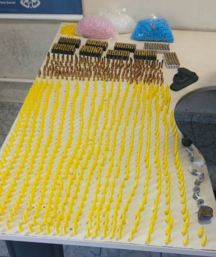 Após verificarem a mochila, os policiais militares encontraram 629 pinos de cocaína, nove buchas de maconha, um pedaço da mesma substância, uma porção de cocaína, 459 munições calibre 9mm, 50 munições calibre .40, 171 munições calibre 380 e 53 munições calibre 38, além de três sacos plásticos contendo pinos vazios utilizados para comercializar cocaína.
