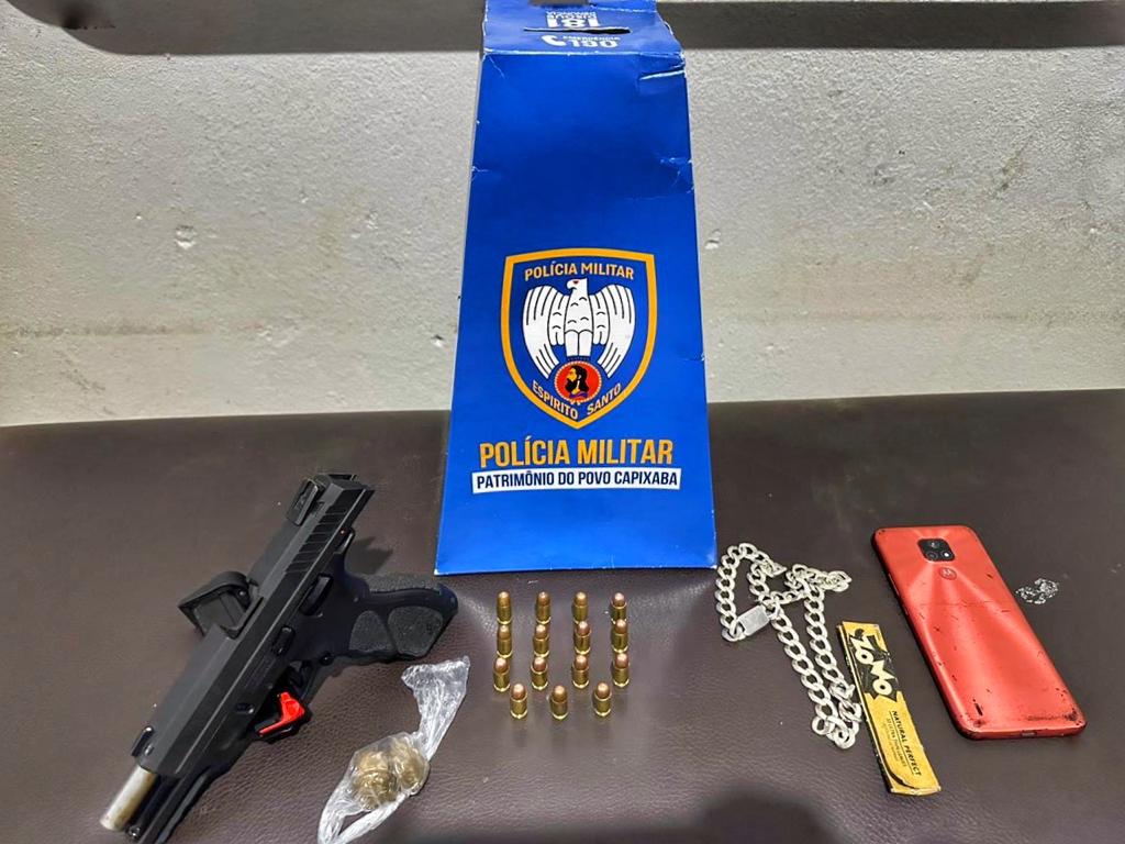 Em posse dela os agentes apreenderam 01 Pistola Taurus, modelo TH380, calibre .380ACP, municiada e carregada com 15 munições do mesmo calibre, além de 02 (duas) buchas de maconha.