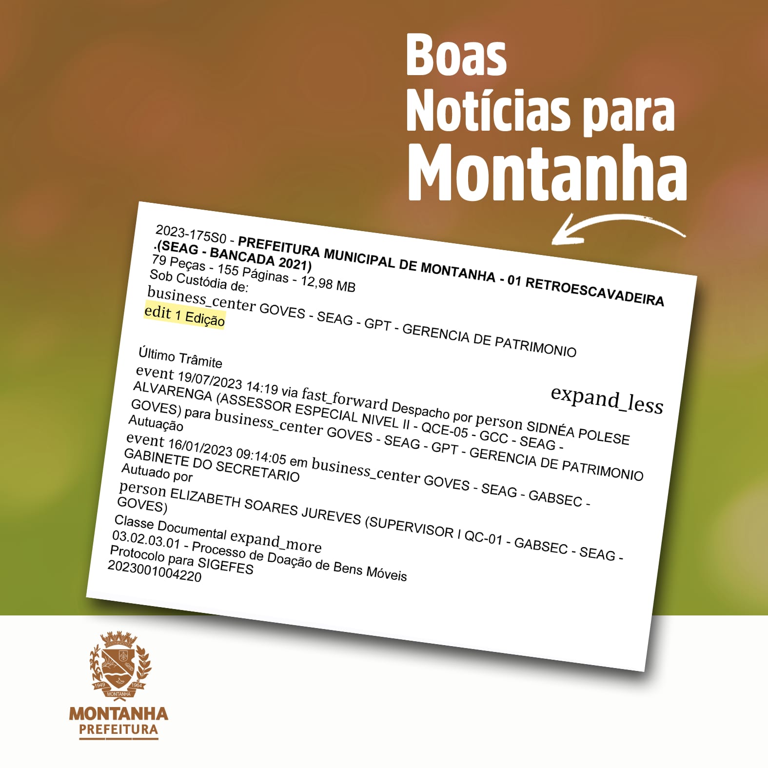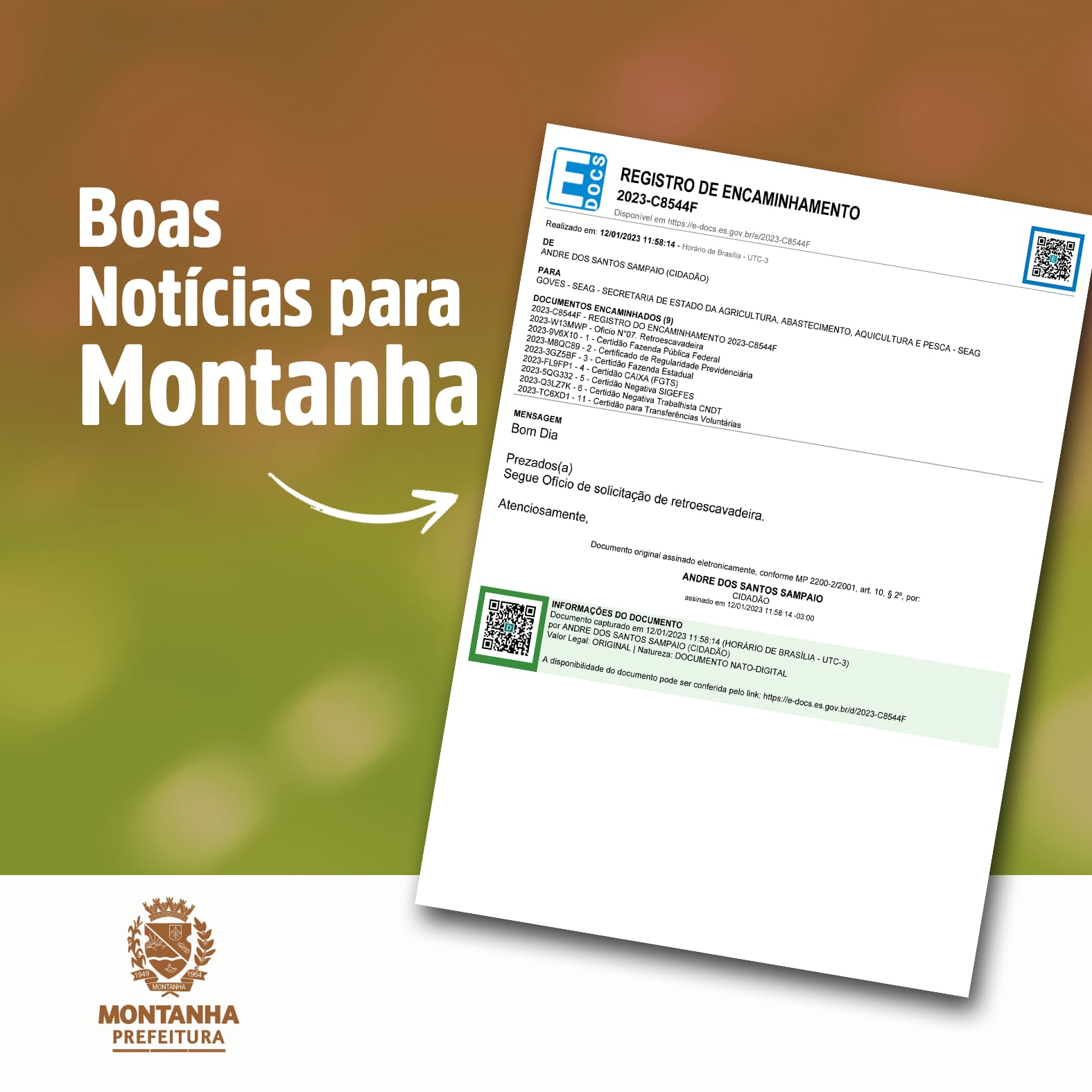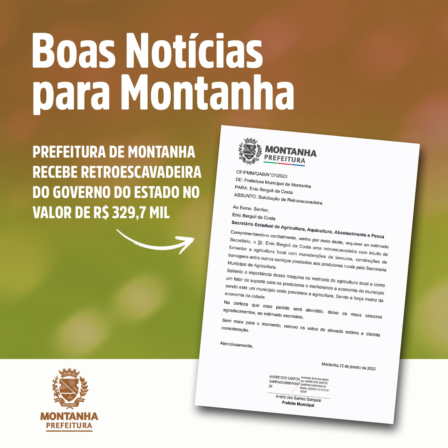 Em solenidade realizada pelo Governo do Estado no dia 04 de agosto, em Vitória, o prefeito de Montanha, André Sampaio e a secretária municipal de agricultura Fátima Barros, receberam a primeira retroescavadeira destinada ao município neste ano. No valor de R$ 329,7 mil, o maquinário foi uma aquisição atendida pela deputada federal Norma Ayub a um pedido feito no início do ano pelo atual prefeito do município.