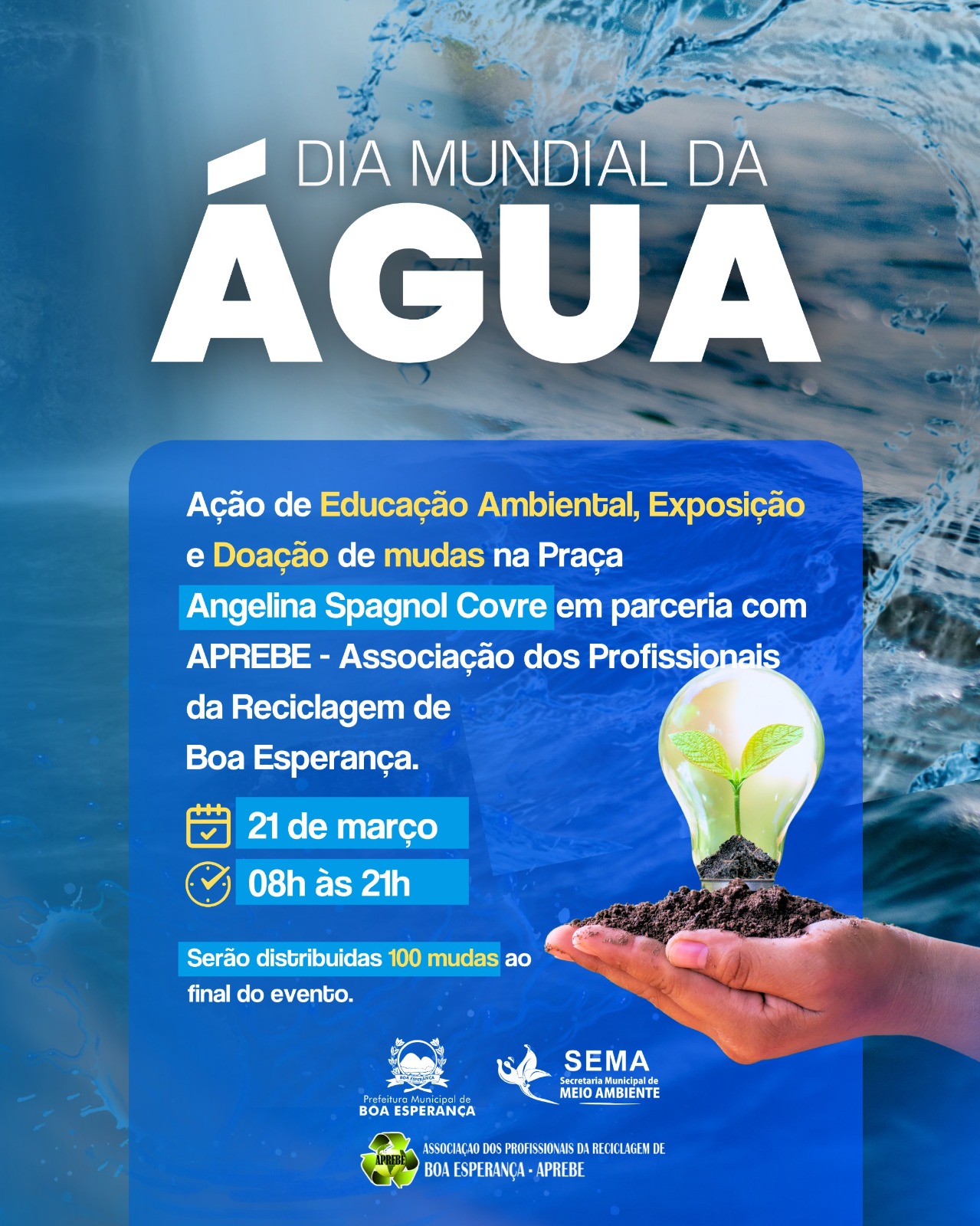 A Prefeitura de Boa Esperança, através da Secretaria de Meio Ambiente, celebrará o Dia Mundial da Água no dia 21 de março com uma série de atividades voltadas para conscientização e preservação ambiental sob o tema: “A Importância do Dia Mundial da Água”. A iniciativa visa sensibilizar a população sobre a significância dos recursos hídricos e incentivar práticas sustentáveis.