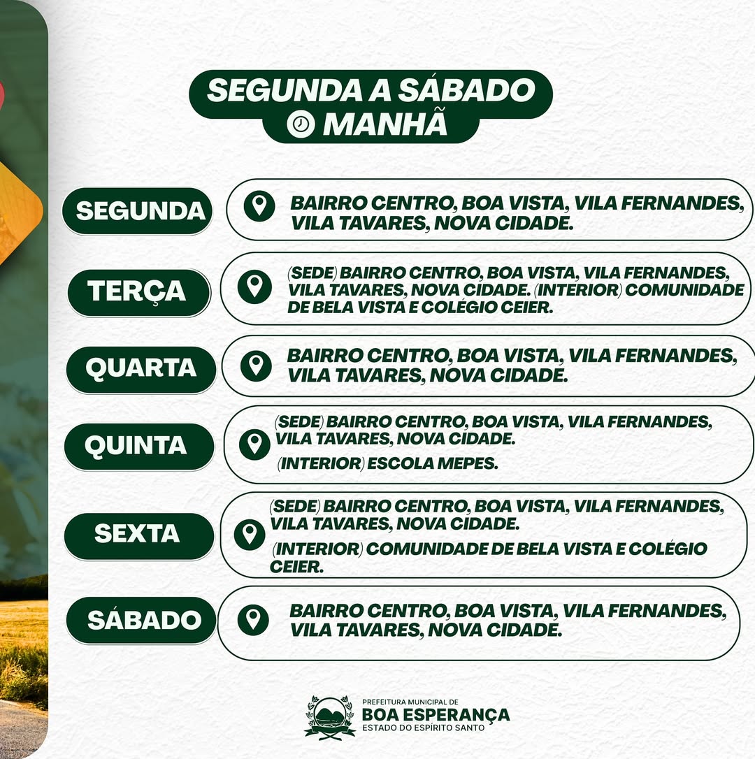 A Prefeitura de Boa Esperança, por meio da Secretaria Municipal de Obras, está reforçando junto à população a importância de seguir corretamente o cronograma de coleta de lixo em todos os bairros e comunidades do município. A iniciativa busca garantir mais organização, limpeza urbana e bem-estar para os moradores, além de contribuir diretamente para a preservação do meio ambiente.