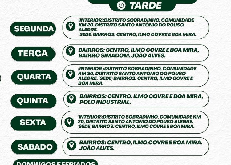 De segunda a sábado, a coleta acontece nos turnos da manhã e da tarde, contemplando diferentes regiões da cidade e do interior. Aos domingos e feriados, a rota se concentra na região central, atendendo principalmente a rota do comércio local.