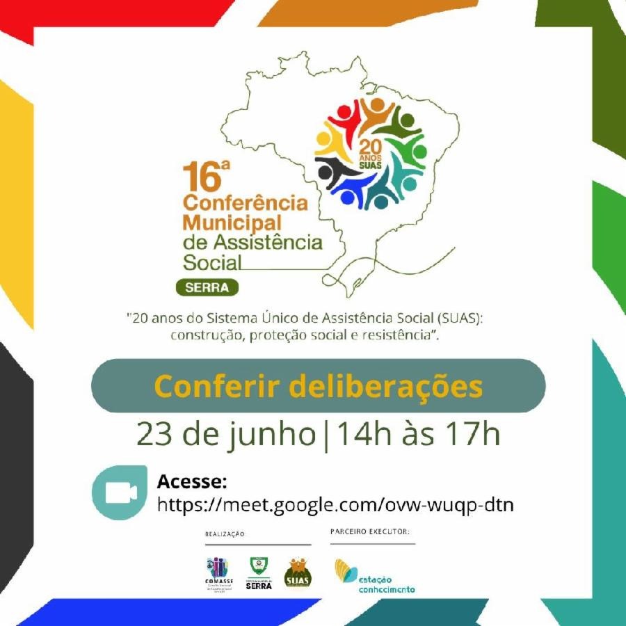 A 16ª Conferência Municipal de Assistência Social da Serra será realizada nos dias 3 e 4 de julho. E como parte das etapas obrigatórias que antecedem o evento, o Conselho Municipal de Assistência Social convida representantes do governo e da sociedade civil para duas reuniões ampliadas, que ocorrerão nos dias 23 e 30 de junho.