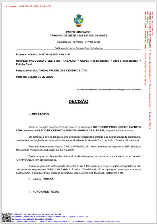 A decisão favorável ao Trio Chapahall’s ocorreu nesta quinta-feira (27), na 3ª Vara Cível da Comarca de Rio Verde, Tribunal de Justiça do Estado de Goiás, e foi deferida pela juíza de Direito Renata Facchini Miozzo. O Processo é de número 5428790-86.2023.8.09.013.